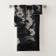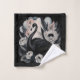 A graceful black swan is poised among soft white and peach silk flowers, creating a striking balance of contrast and delicacy. The contemporary subtle palette of light black, grey, soft peach, and white flows harmoniously.