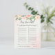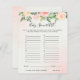 This baby shower game card features beautiful soft pastel watercolor roses and peonies in shades of blush pink and peach with lush green botanical leaves and eucalyptus.