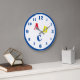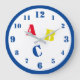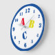 Design features the letters "ABC" in primary colors and large, stenciled font. Clock numbers are displayed in a blue, easy-to-read print. The 12, 3, 6 and 9 slightly larger than the rest of the numbers. Entire design is encircled in a blue border. Also available in red.