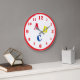 Design features the letters "ABC" in primary colors and large, stenciled font. Clock numbers are displayed in a blue, easy-to-read print. The 12, 3, 6 and 9 slightly larger than the rest of the numbers. Entire design is encircled in a red border. Also available in blue. Coordinates with the "Personalized Alphabet Nursery Collection."