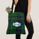 Colorful plaid tote bag done in the traditional blue, green, white, and black clan Abercrombie tartan pattern. A decorative white text plaque, on the front of the bag, has custom blue text ready to personalize. Great all purpose tote.