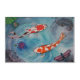 Original watercolor painting by Sandra Gale, featuring an overhead view of a fresh water koi pond. The blue water has two fancy koi fish swimming around a violet waterlily flower as a curious dragonfly drifts above them. Great design for nature, fish or Koi pond lovers!