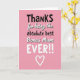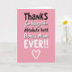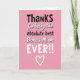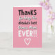 This greeting card features a soft blush-pink background with the message centered in the middle. The first word, “Thanks,” is written in black, simple printed letters that stand out right away. Below it, the phrase “for being the absolute best Bonus Mum” appears in white, flowing cursive-style lettering that feels gentle and caring. At the bottom, “EVER!!” is set in big white all-caps printed letters with two exclamation marks, giving the note an excited, happy tone. A small white heart outline sits under the words like a sweet finishing touch ❤️. The mix of black and white text on pink keeps everything easy to read while still feeling warm and loving. It’s a meaningful card to give a bonus mum because it clearly says she matters and that you’re grateful for her place in your life 🥰.