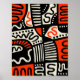 A bold original hand drawn abstract design in black, orange red, and cream.