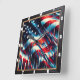 This square wall clock features a striking abstract design inspired by the American flag. Dynamic patterns of red, white, and blue, along with stylized stars, create a vibrant and modern artistic piece. Perfect for home or office decor, this unique timepiece embodies patriotism and national pride, adding a bold statement to any interior.