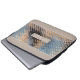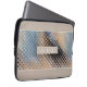 A modern design laptop sleeve featuring an abstract art glass dots pattern in blue, grey and beige. The top and bottom tan area are optional as well as the text and text background.