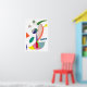 The artwork is a vibrant abstract composition featuring a variety of geometric shapes and curved lines. The piece utilizes a diverse color palette including bold shades of green, orange, red, yellow, blue, purple, and teal.