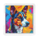 Bright and lively abstract illustration of a Basenji dog using bold colors and sharp lines. Perfect for art enthusiasts and those inspired by creative and vibrant pet portraits.