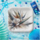 A delicate composition features an abstract bird of paradise flower in muted blue, green, and orange tones