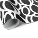 A modern abstract pattern with white curved lines crossing and joining each other on black background.