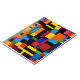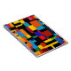 Earth brown, sandy tan, turquoise blue, sunset purple, sunshine yellow, and cactus flower red and pink, interspersed with black lines in rectangular blocks of color.