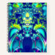 Abstract spiral notebook features fractal art in vibrant colors: blue, cyan, green, and purple. Same image is on the back side.