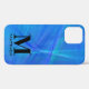 This iPhone 12 case features an abstract blue fractal flame with a bold black monogram and a name below it.