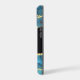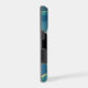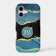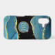 This elegant phone case features your two letter monogram in pale gold at the center of a blue circle banner that is double framed in gold. The banner is placed on an abstract background in tones of blue alcohol ink, black border, and gold embellishment.