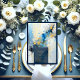Plain white envelopes are included with paper invitations and will come to fit the invitation size you select. If you don’t need the envelopes, you may choose to not receive them by selecting the dropdown below "Envelopes" and choosing "None." If you’d like to have a design on your envelopes, you can browse all of these available envelopes to find the design that complements your Abstract Blue Gold Ink Splatter Artwork Wedding Invitation.