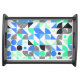 This modern serving tray features colorful geometric design in black, blue and green shades on white background.
