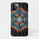 This iPhone 11 case features an abstract symmetrical design with flames in orange and blue on a black background.