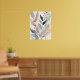 This print features an abstract image of botanicals in neutral shades of muted tan or beige and gray on a white background with small splatters of paint in matching colors. This attractive poster has a boho chic aesthetic and will provide a touch of nature and sophistication to any room. This unframed print is available in various sizes to fit standard frames.