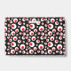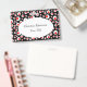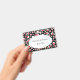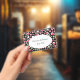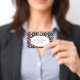 This name or identification badge has a bright abstract circular pattern of white circles with smaller red circles inside on a black background. Customize your name and information in the white oval with the templates.