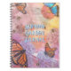 Personalized, spiral-bound notebook with butterflies and hydrangeas design. Blue butterflies and orange Monarchs, along with little bumblebees, fly to hydrangeas and other flowers. Colors are pink, blue, yellow and orange with printed, light blue text. Perfect for the nature lover and flower grower.