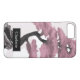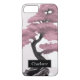 Beautiful pink cherry blossoms adorn this abstract cherry tree bonsai phone case. It also features a personalized name badge in black with white text at the bottom center.