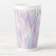 An abstract chevron design in a purple, turquoise, ivory and white palette.