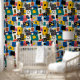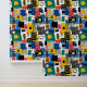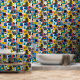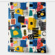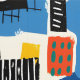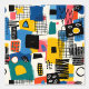 This artwork features a dynamic and eclectic composition of abstract shapes, patterns, and textures, layered together in a collage-like arrangement. The design incorporates bold colors such as blue, yellow, red, and black, with each element varying in size and form. Hand-drawn lines, grids, and brushstrokes add a playful and spontaneous feel to the piece, while the irregular arrangement of the shapes creates a sense of movement and energy. The combination of geometric forms and freehand marks gives the artwork a modern, artistic vibe.
