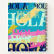 Hola text repeated in a colorful palette of blue, yellow, pink, turquoise and green.