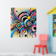 Vibrant and dynamic abstract design filled with circular shapes in various sizes and colors, including blue, pink, yellow, and black. The overlapping circles and wavy lines create a sense of motion and energy, enhanced by splashes of paint and dots, on a subtle beige background.