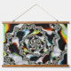 This hanging tapestry features an abstract psychedelic spiral fractal art in black and white with yellow, orange, blue, and green accents.
