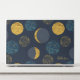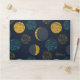 Fun abstract pattern of moon and stars on a dark blue background with printed gold foil accents.