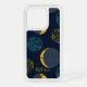 Fun abstract pattern of moon and stars on a dark blue background with printed gold foil accents.