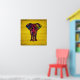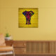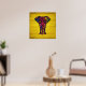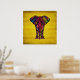 A poster with an abstract elephant design with a rainbow selection of bright vivid colors with decorative designs inside such as mandalas and geometric leaves and flowers. Set on a vintage style background in warm yellow with faded stripes.