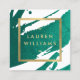 Dark, emerald green paint brushstrokes create an abstract backdrop on this designer square business card template. Your name or business name is displayed in a faux gold box on the front for a modern aesthetic. This double-sided card allows ample room on the backside for your contact info. A fun, eye-catching card for creative professionals. Art and design © 1201AM Design Studio | www.1201am.com