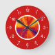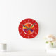 This round wall clock features white numerals and an abstract fiery fractal art in golden yellow, orange, red, and purple on a red background.