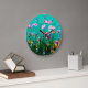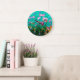 An impressionistic or abstract painting of flowers against a background of mountains. In rich, vibrant jewel tone colors of turquoise, blue, green, pink and orange.