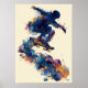 This abstract fluid ink artwork portrays a skater in mid-jump, formed by flowing layers of blue, gold, and violet. The composition expresses speed, balance, and rhythm while maintaining a clean, contemporary aesthetic. Ideal as modern wall art for interiors, studios, and creative environments.
