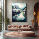 Experience the serene beauty of India with this abstract geometric skyline artwork. Featuring iconic temple architecture, tranquil waterways, and majestic mountains in the background, this cubist-inspired piece combines bold geometric patterns with a calming palette of green, blue, and white tones. Perfect for modern, minimalist, or eclectic interiors, this artwork offers a contemporary and artistic interpretation of India’s timeless elegance. A stunning choice for art and travel lovers.