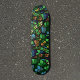 This deck showcases a complex, fragmented pattern reminiscent of shattered stained glass or stylized dragon scales. The color palette is a rich, deep fusion of forest greens, emeralds, navy blues, and charcoal purples, highlighted by striking accents of ochre and burnt orange. Each geometric segment is outlined in black, creating a bold, high-contrast look that pops whether you are grinding rails or hanging it on your wall as a statement piece.