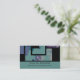 Cool artistic design with all kinds of different colors and sizes of squares floating around. A black square maze, celtic style knot creates an interesting border design in this piece. The colors in this design are muted and subtle in varying shades of purple and green. Modern business card design.