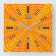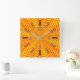 This vibrant, eyecatching square clock design features an orange and yellow abstract sun-like pattern. It also features rectangles marking the hours, and numbers indicating the hours "12", "3", "6", and "9".