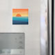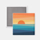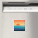 Abstract illustration of colorful (yellow, orange, blue, turquoise) sunrise by the sea with diagonal lines and sun decoration