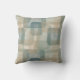 This throw pillow features an abstract geometric watercolor pattern of overlapping rectangles in teal, olive green, beige and cream.