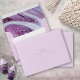 This wedding design set, with it's abstract pattern of flowing ripples and veins of glittering plum, brings to mind eye-catching rock formations and sparkling gems. The striking color palette in shades from lilac and lavender to soft periwinkle adds to the appeal. The coordinating envelope shown here has all the above with an abstract interior and optional soft lavender exterior. Easily add your initials and address using the provided template. Search ID903 to see other color choices and coordinating pieces for this unique wedding collection.