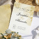 Handwritten calligraphy adds a personal touch, infusing the card with warmth and intimacy. Each word is delicately penned, reflecting the couple's unique love story and inviting loved ones to mark their calendars for a special occasion. Subtle hints of gold watercolor glitter sparkle dust dance across the card, adding a touch of whimsy and enchantment.