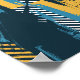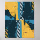 A modern abstract composition blending bold yellow, blue, and dark tones with grunge-style brush strokes and striped patterns. The intersecting shapes and textures create a sense of raw energy, movement, and urban industrial aesthetics.