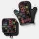 Discover a chic, contemporary oven mitt and pot holder set that boasts a playful and attractive design featuring geometric circles and half circles in dark brown, beige taupe, teal blue, dark pink, rust orange and olive green colored geometric circles and half circles pattern on a black background. This set embodies an elegant, stylish, and eclectic minimalist design, perfect for the artistic interior designer, the artsy décor enthusiast, the trendy hipster, the lover of vintage retro art, or the aficionado of abstract digital geometric motifs. Its artistic and modern aesthetic exudes colorful sophistication, making it an ideal choice for the fashion-forward trendsetter with a penchant for mixing vintage and contemporary elements in kitchen decor. Essential for any home cook, baker, or culinary expert, this set is the epitome of style meets functionality.