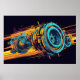 Inject a massive dose of raw, industrial energy into your living space with this striking horizontal poster. This artwork captures a complex, mechanical turbine in a dynamic, high-speed moment. The brilliant fusion of a gritty grunge texture with an intensely vibrant, cyberpunk color palette of cyan and electric orange creates a breathtaking visual experience. The aggressive diagonal composition and stylized paint splatters make this piece feel alive and constantly in motion.