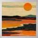 Artwork depicting an abstract landscape in warm hues with a setting sun, creating a serene and minimalist design. The composition blends texture with simplicity, evoking tranquility and artistic expression.