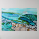 This is an abstract painting of a seaside village. The waves of the sea, intertwined land and water and the town of homes. Painted in shades of blues and greens.